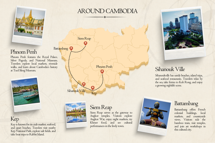 Key cities: Phnom Penh - Kep - Sihanouk Ville - Battambang - Siem Reap